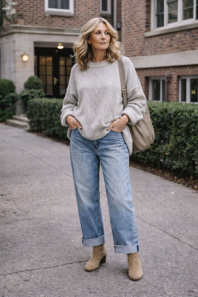 Pair it with slim or straight-leg jeans without cuffs to create a balanced, elongated silhouette that still feels comfortable but looks intentionally styled and age-appropriate.