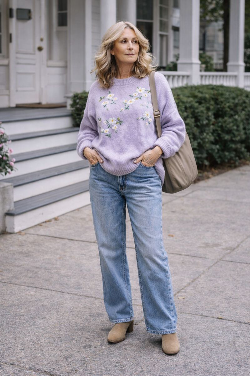 Pastel sweaters with dated motifs like embroidered flowers, cats, or holiday themes scream “grandma” in the most unflattering way.