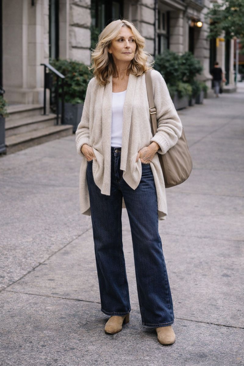 Pairing one with too-dark, overly formal bootcut jeans creates a strange contrast—the cardigan is casual and drapey, while the dark jeans feel stiff and dated.