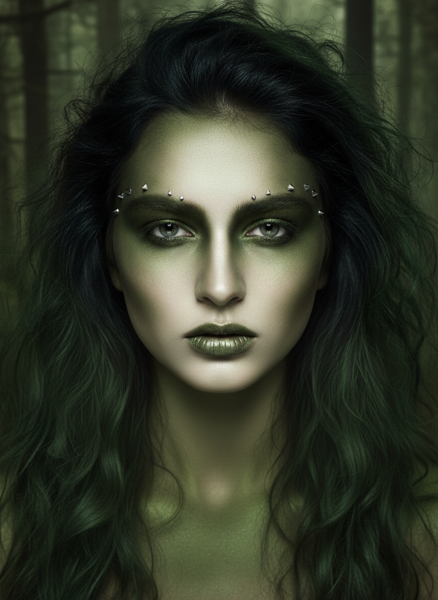 This look leans into murky, swamp-like olive and forest greens packed heavily onto the lids and smoked out dramatically beneath the lower lash line.