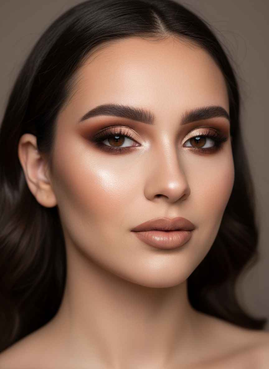 A soft caramel contour sculpts the face subtly while a precise, high-contrast cut-crease in rich brown creates unexpected drama on the eyes.