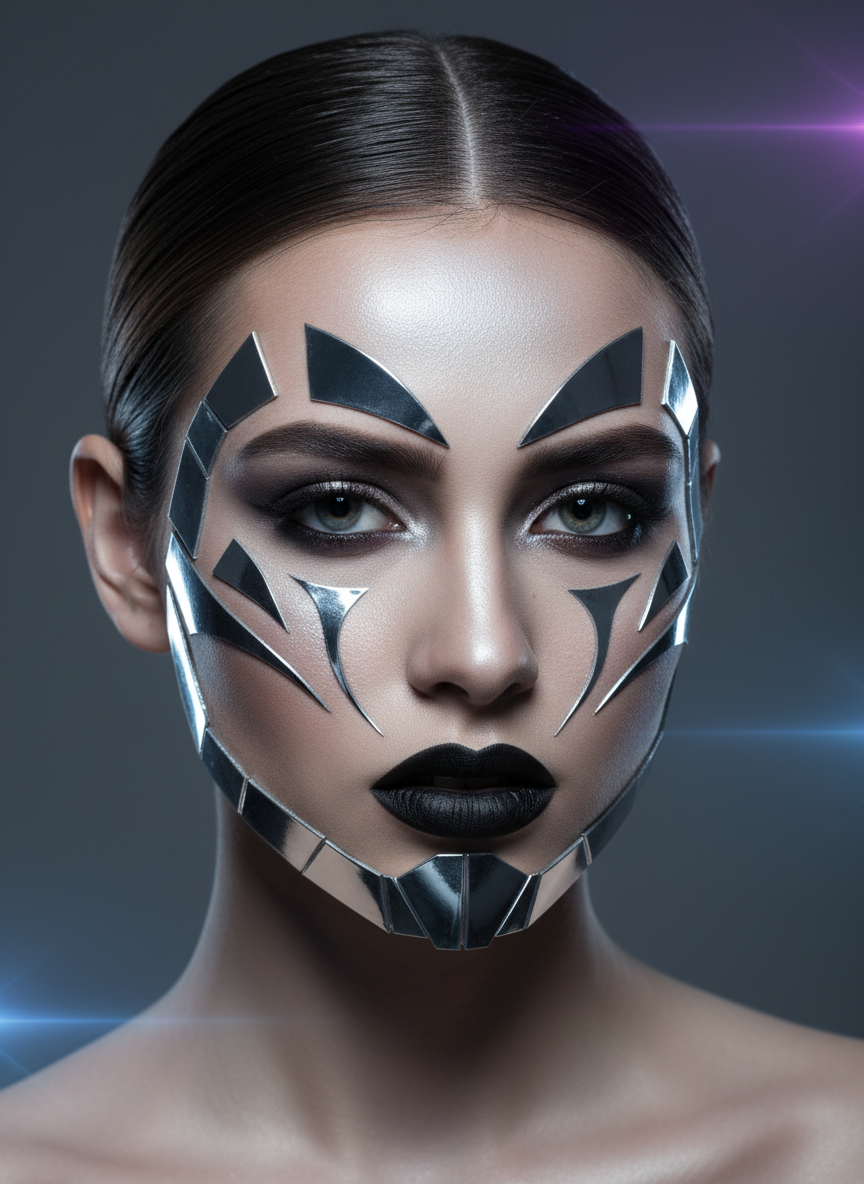 This look abandons traditional placement rules and treats the face like a three-dimensional canvas where metallic accents belong anywhere they look interesting — think chrome on the nose bridge, silver foil beneath the brow, or liquid metal framing the temples.