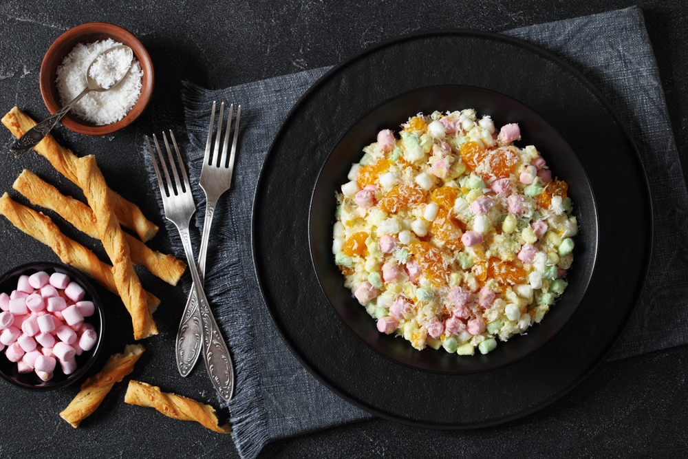 Ambrosia salad mixed canned fruit cocktail, mini marshmallows, shredded coconut, and sour cream or whipped cream into a fluffy, sweet side dish.
