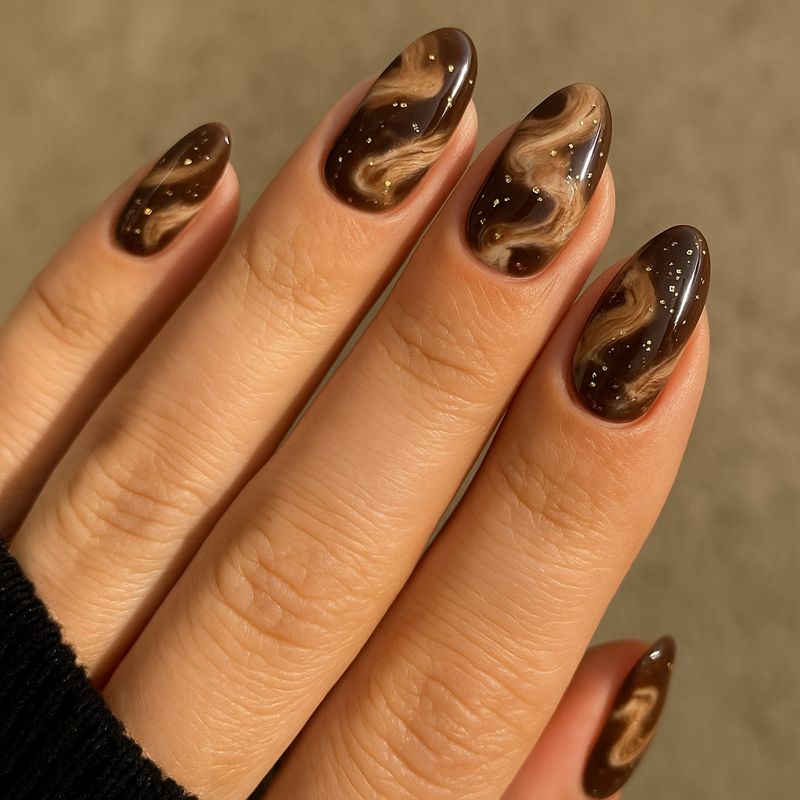 Tiny gold flecks scattered across the nails add that caffeinated sparkle, like coffee beans catching the light.
