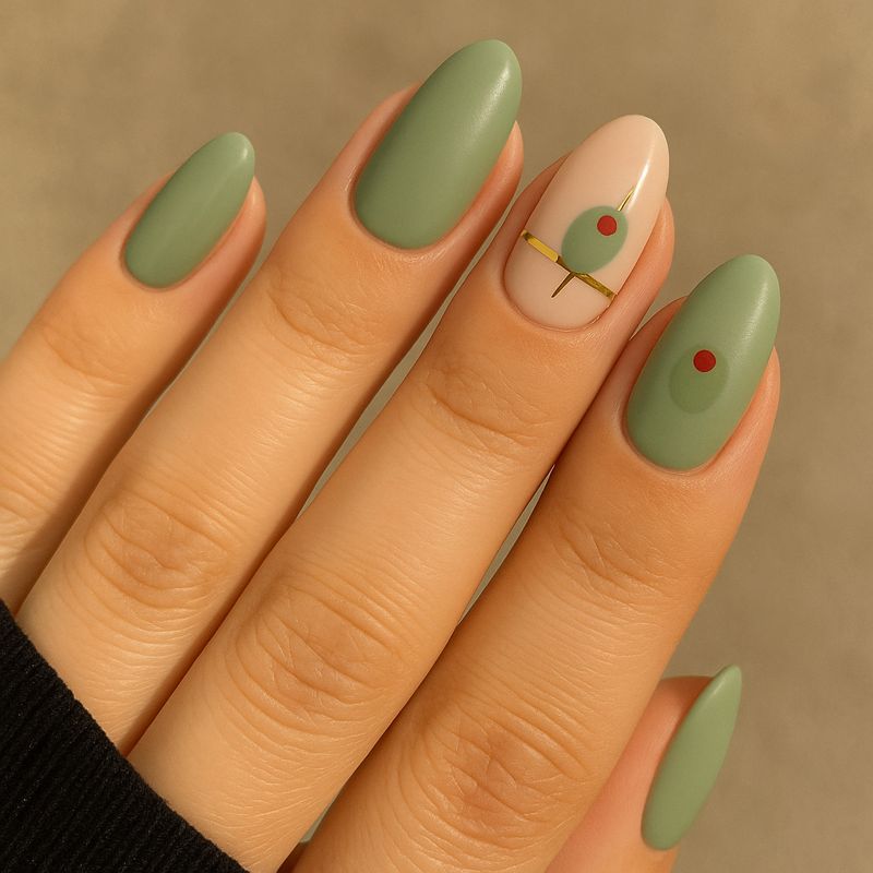 Add tiny hand-painted olives on one or two nails for a playful touch, complete with red pimento dots that pop against the green.