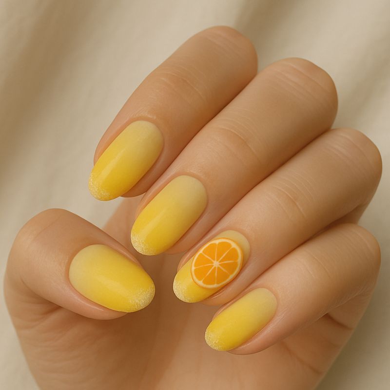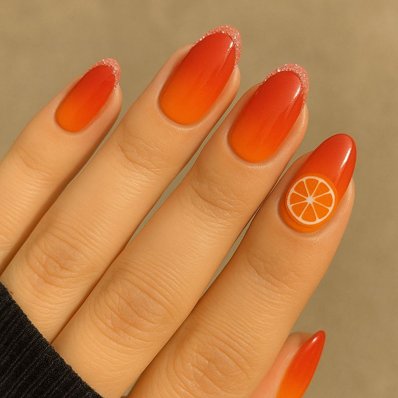 Tiny orange slice decals on accent nails tie the whole theme together, making the inspiration crystal clear to anyone who asks.