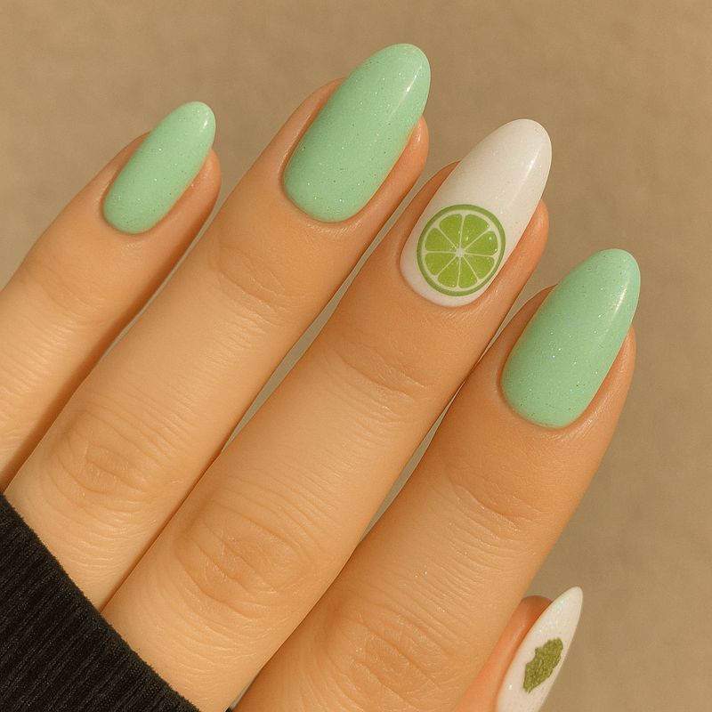 Tiny lime slice decals or hand-painted citrus designs add authenticity, while clear glitter topcoat mimics carbonation bubbles rising to the surface.