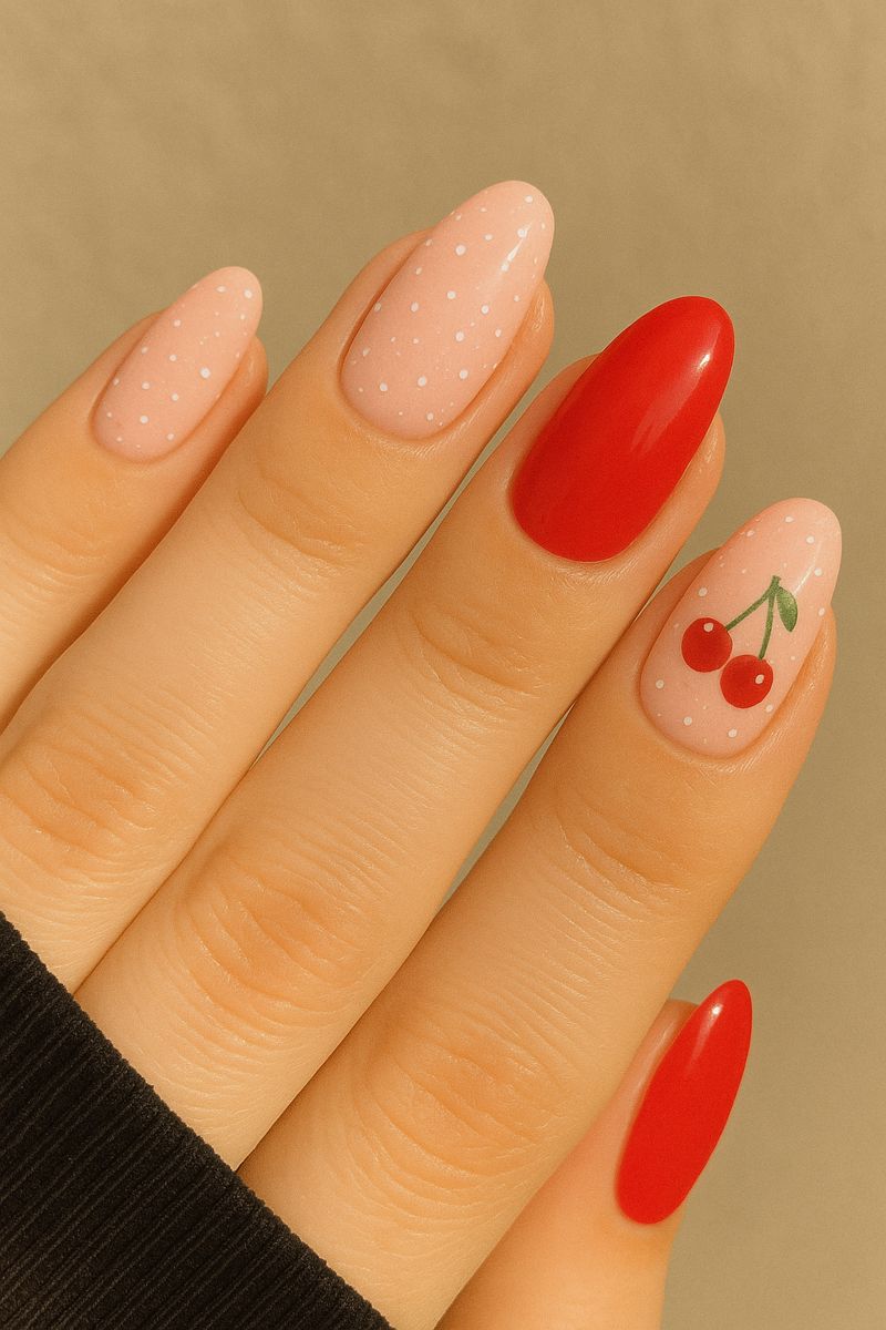 Bright cherry red accent nails represent those iconic maraschino cherries that made every Shirley Temple feel fancy.