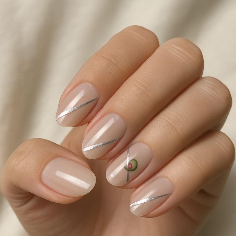 A single diagonal silver stripe across each nail mimics the sleek lines of a martini glass, geometric and modern.