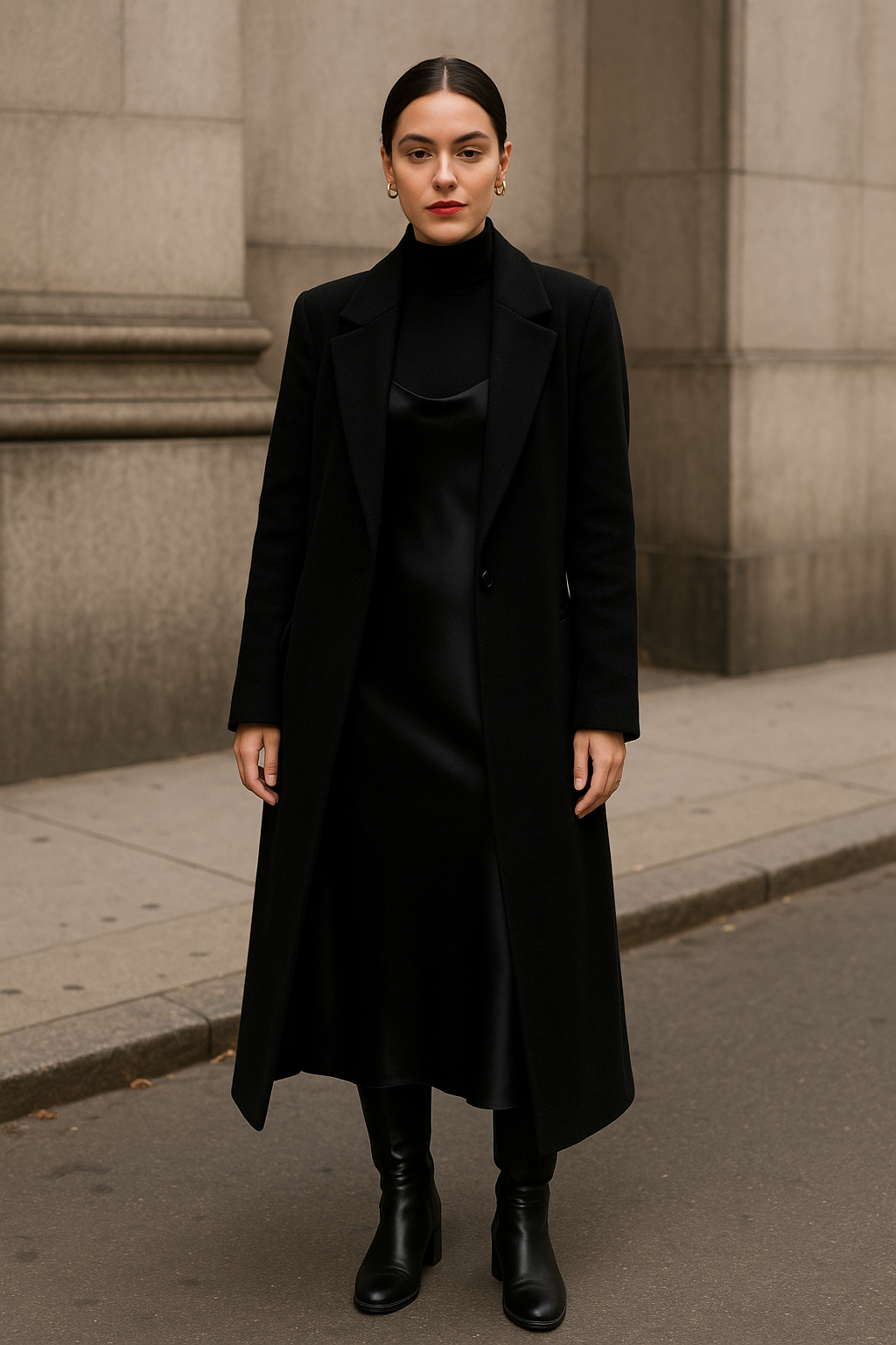 Minimalist perfection arrives when you commit fully to an all-black palette with your slip dress, boots, and coat. This monochrome approach feels timeless, sophisticated, and effortlessly chic without requiring much thought.