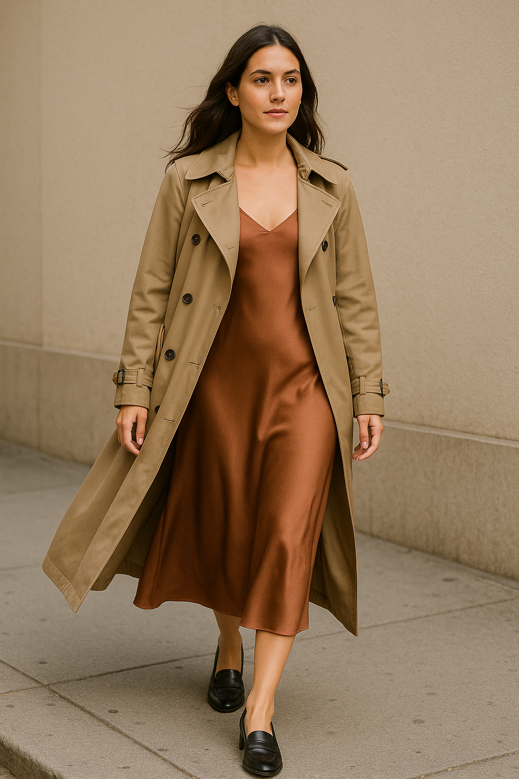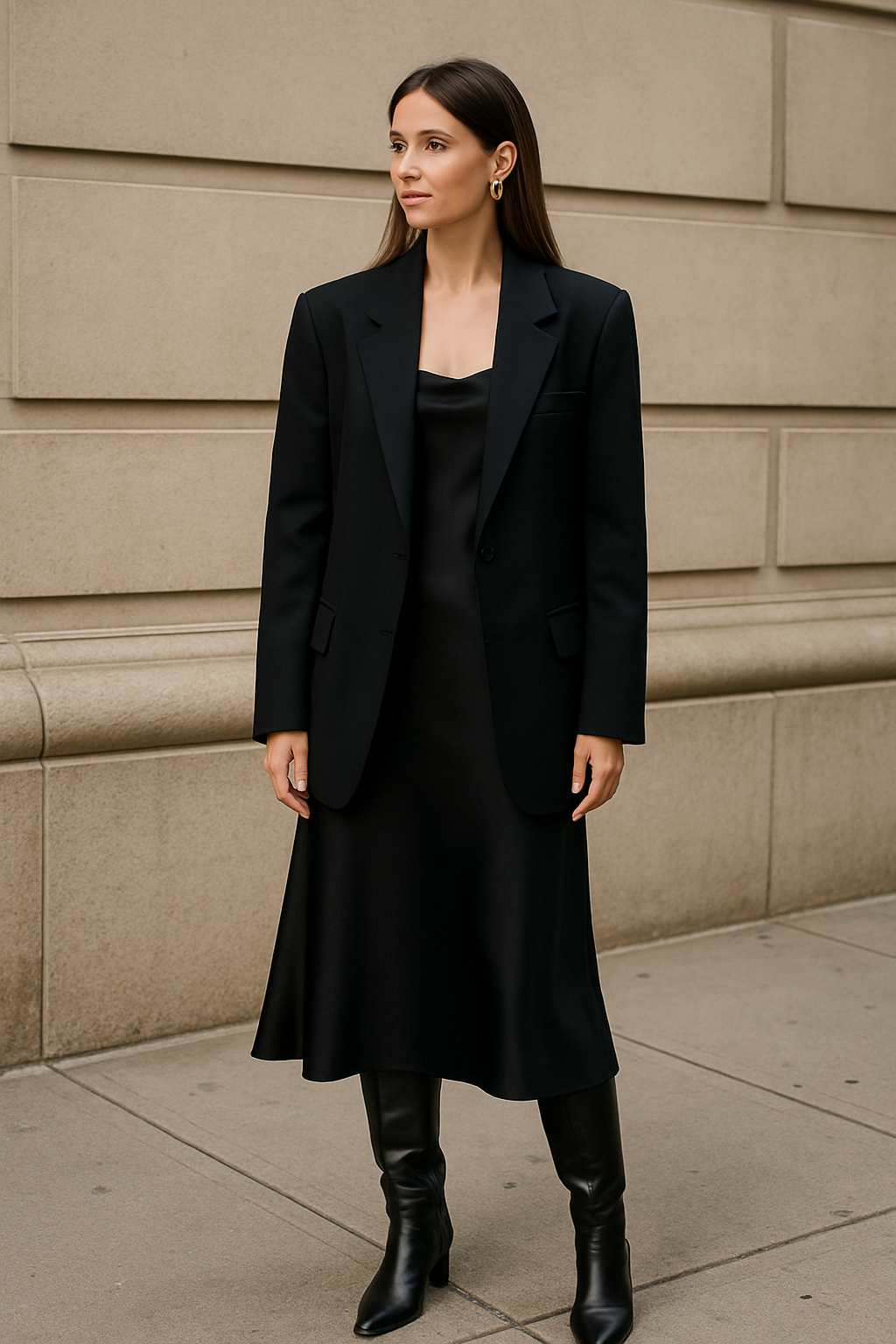 Heeled boots add height and polish, while loafers keep things approachable and comfortable. The blazer structure balances the slip dress’s fluidity, creating a harmonious silhouette.