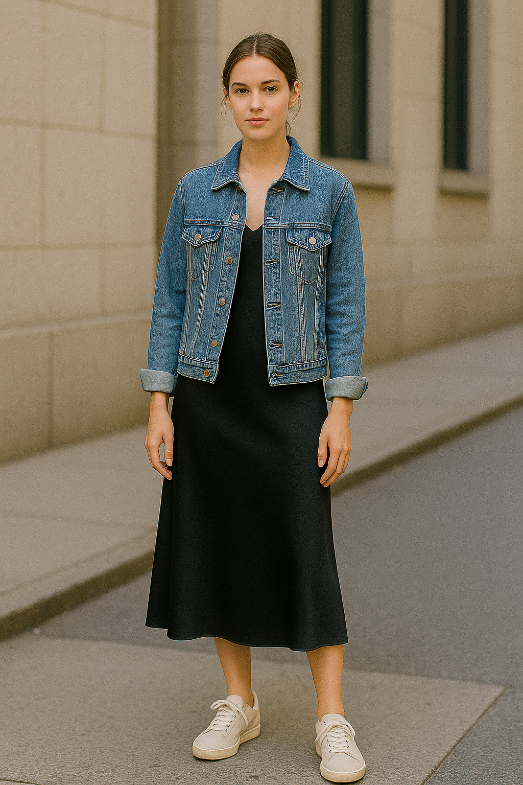 Your trusty denim jacket gets a sophisticated upgrade when paired with a silky slip dress. Whether cropped or oversized, the denim keeps things laid-back while the dress adds intentional elegance.