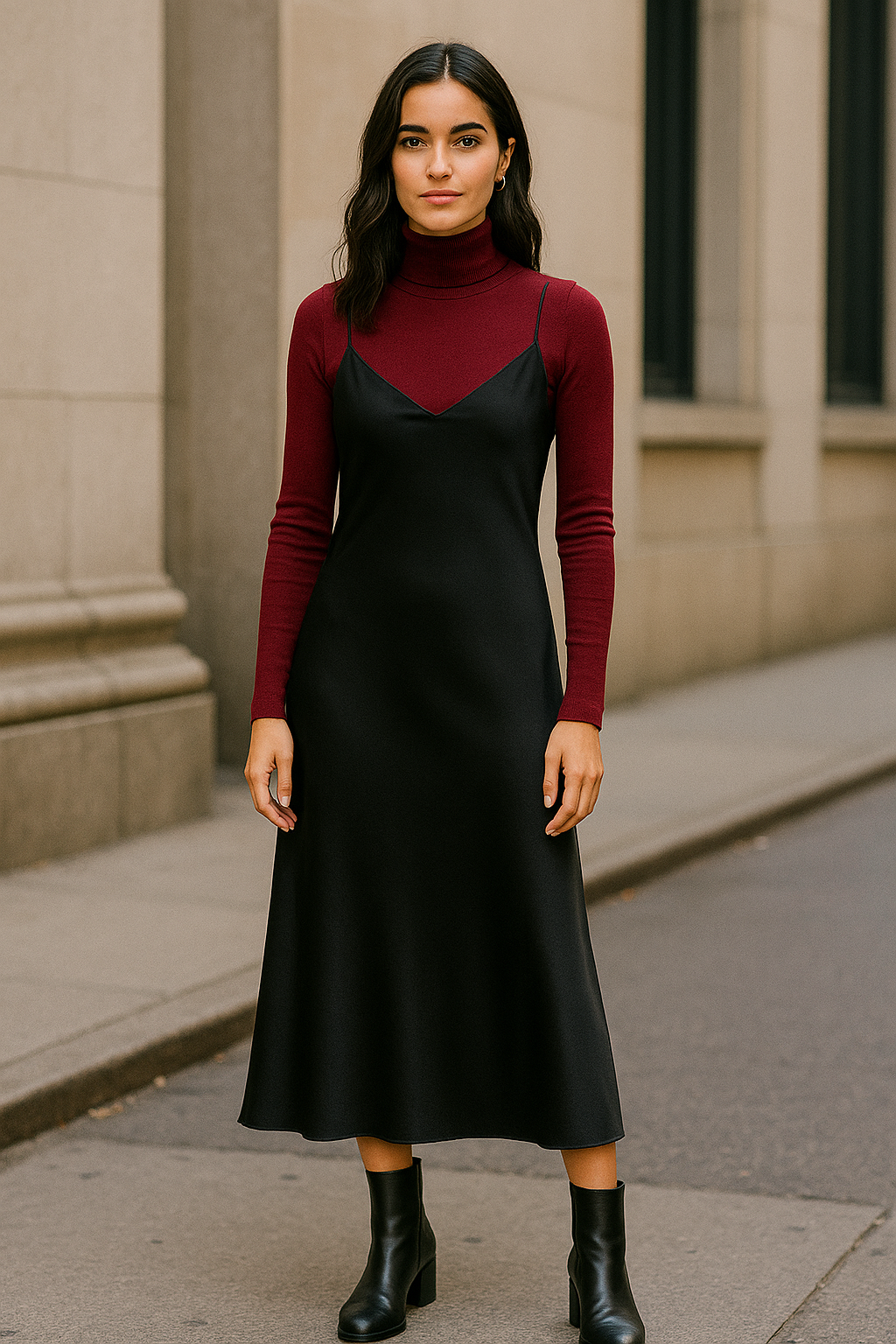 Sliding a thin turtleneck underneath your slip dress solves the temperature problem while adding sophisticated dimension. Monochrome combinations create an elegant, streamlined look that feels very grown-up and polished.