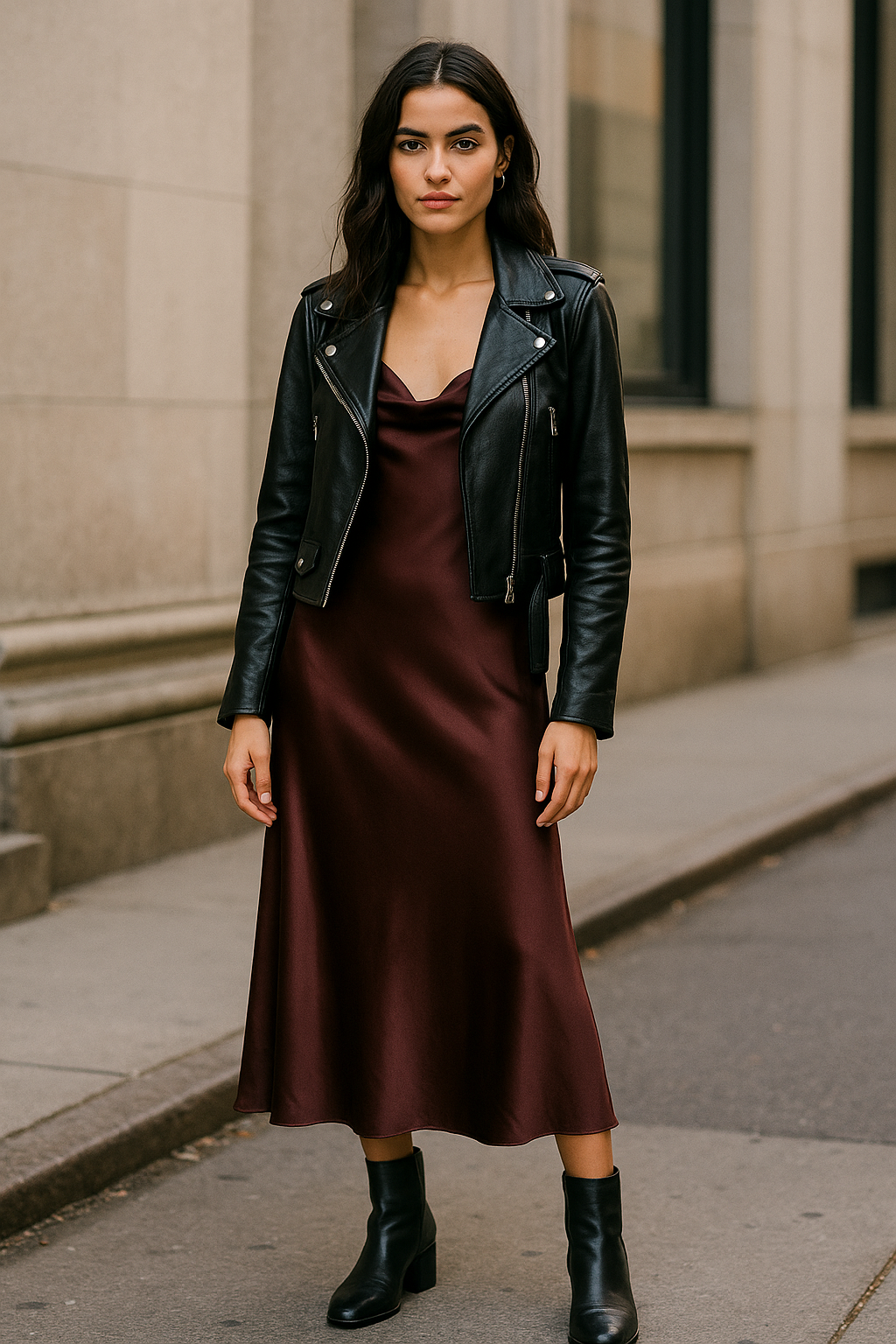 A leather moto jacket instantly transforms delicate satin into something bold and rebellious. The contrast between soft fabric and structured leather creates visual interest that catches everyone’s attention.