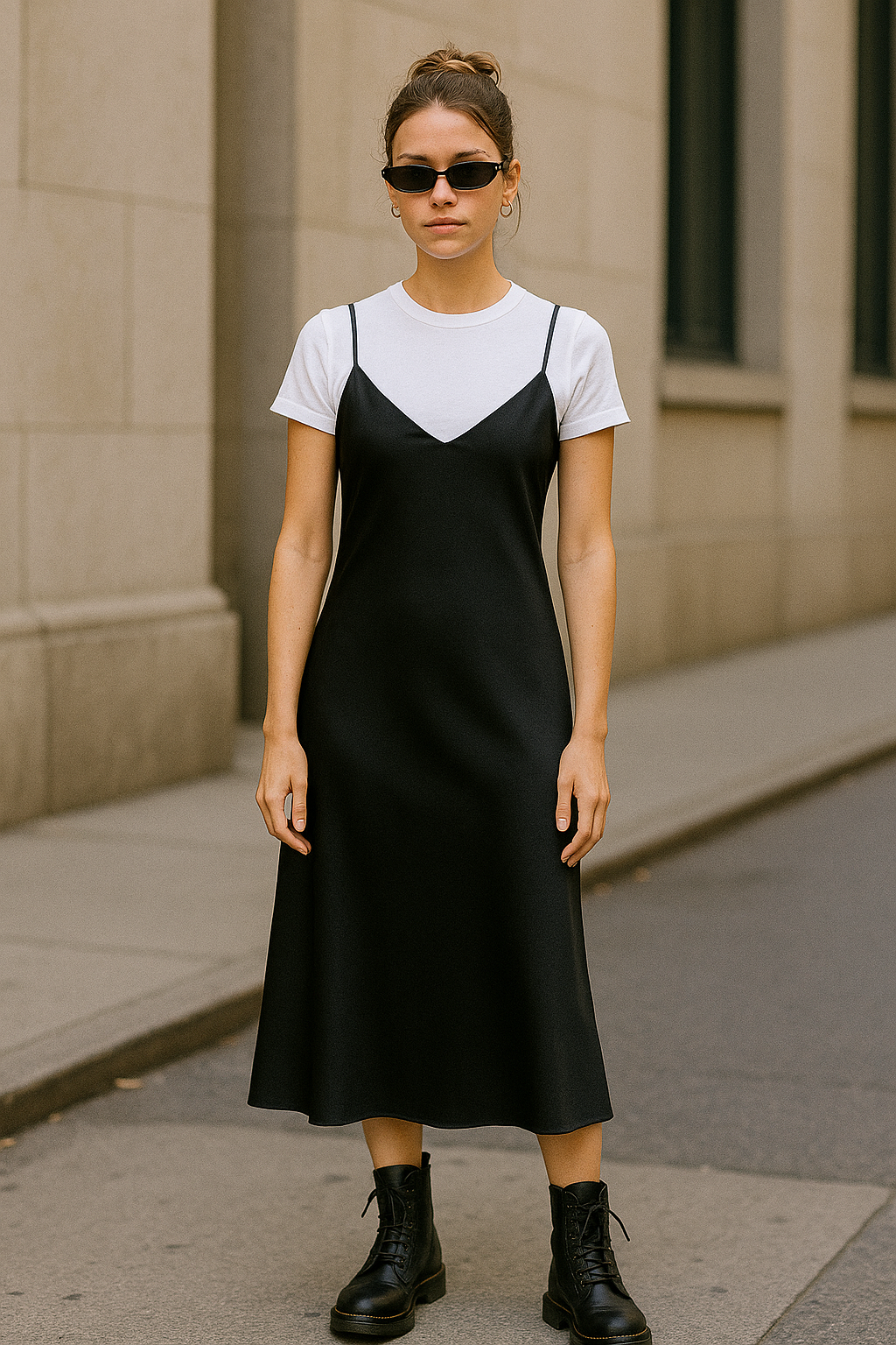 Channel your inner ’90s icon by layering a fitted white tee under your slip dress for that nostalgic throwback vibe. Combat boots or chunky sneakers add the perfect dose of grunge to balance the feminine slip.