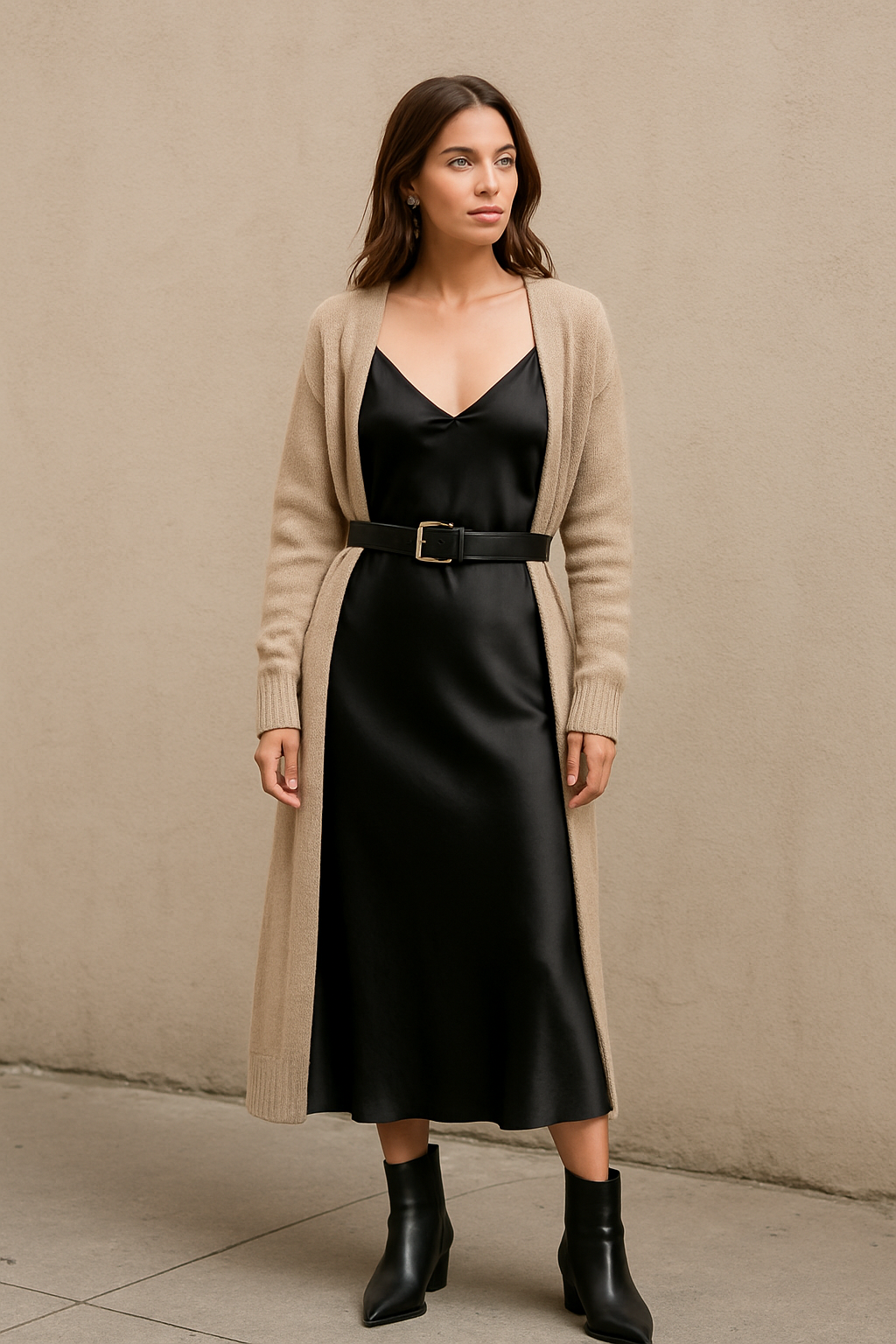 A long cardigan or shacket thrown over your slip dress creates the ultimate cozy-yet-stylish weekend uniform. Cinching it with a belt defines your waist and prevents the outfit from looking too shapeless or oversized.