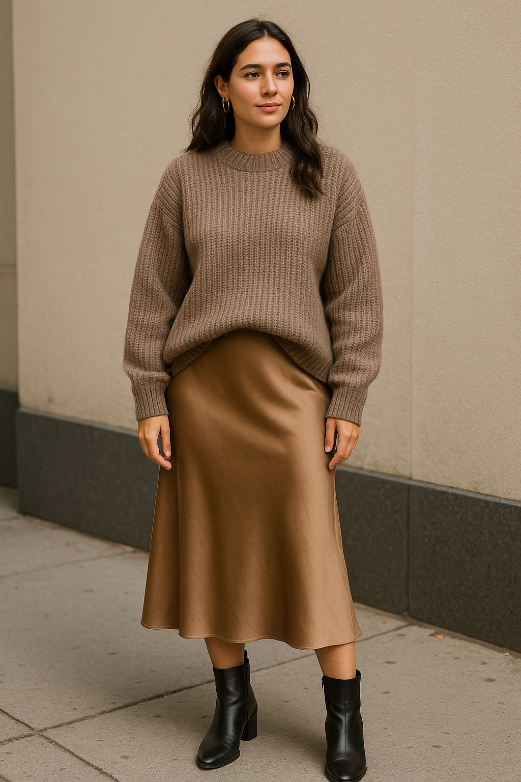 Layering a chunky knit over satin creates an unexpected texture mix that feels both comfortable and stylish. The oversized sweater adds warmth without hiding the elegant silhouette of your slip dress underneath.