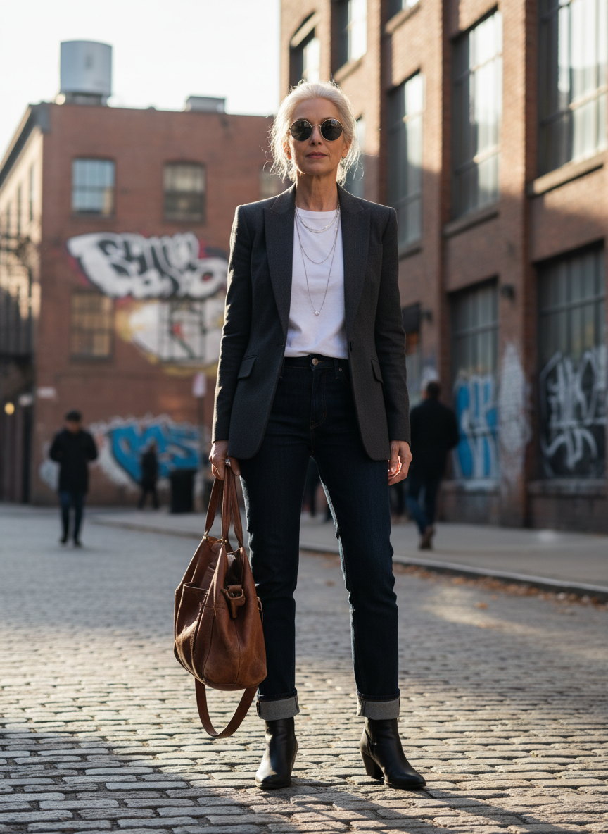 Few combinations beat the timeless trio of a tailored blazer, dark straight-leg jeans, and a simple tee.