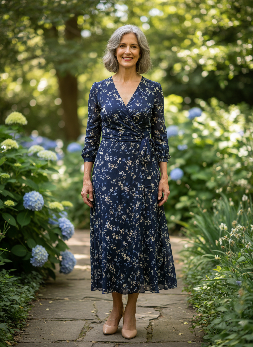 5. Wrap Dress with Low-Heel Pumps or Elegant Flats