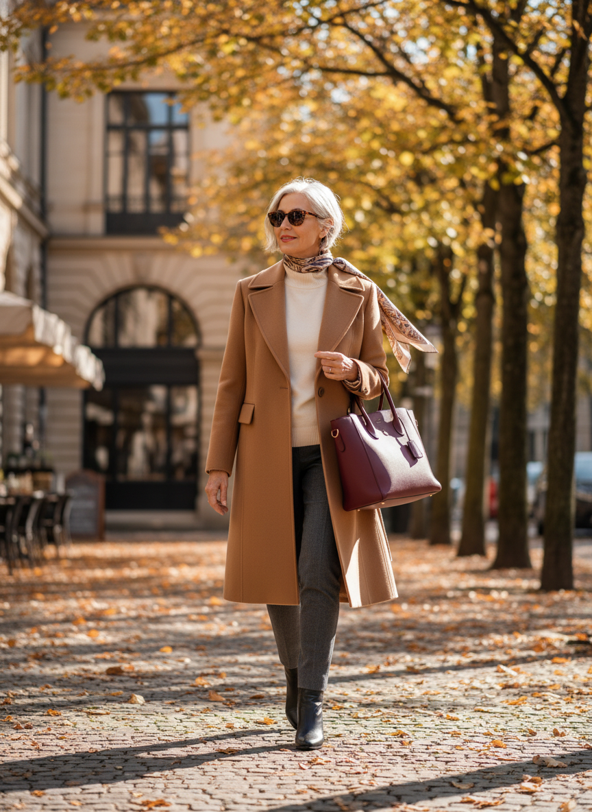 Throwing a structured coat over a simple sweater and slim trousers creates an outfit that looks intentional and polished from the very first glance.