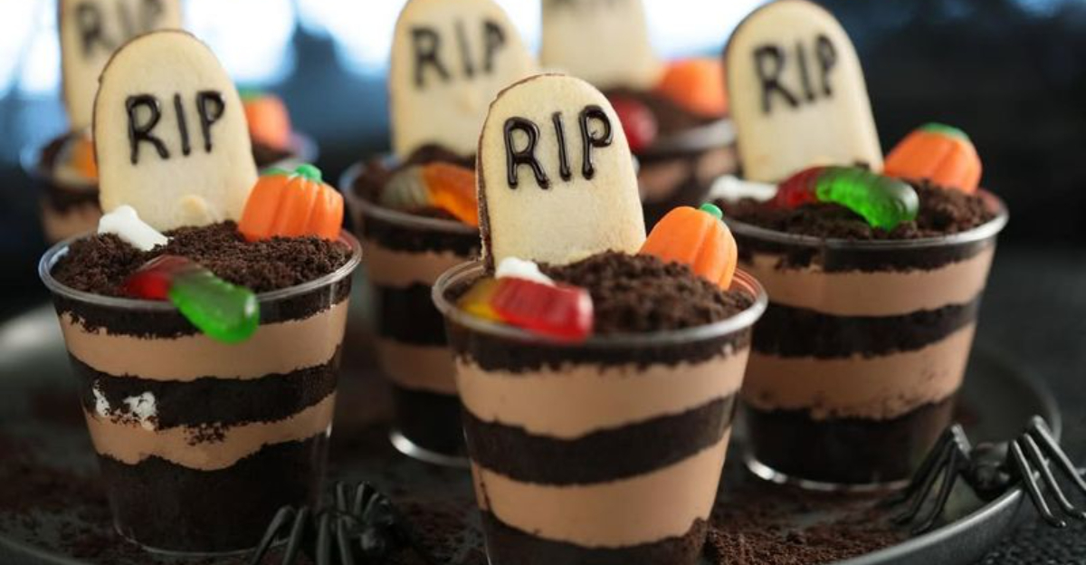 Build deliciously eerie Graveyard Dirt Cups that kids can layer themselves. Spoon chocolate pudding into clear cups, then sprinkle crushed chocolate cookies for the “soil.”