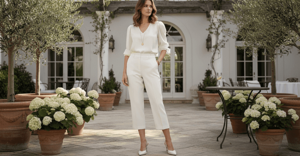 White capris paired with a blouse in a similar ivory, cream, or off-white shade creates a seamless, elongated silhouette that looks genuinely luxurious.