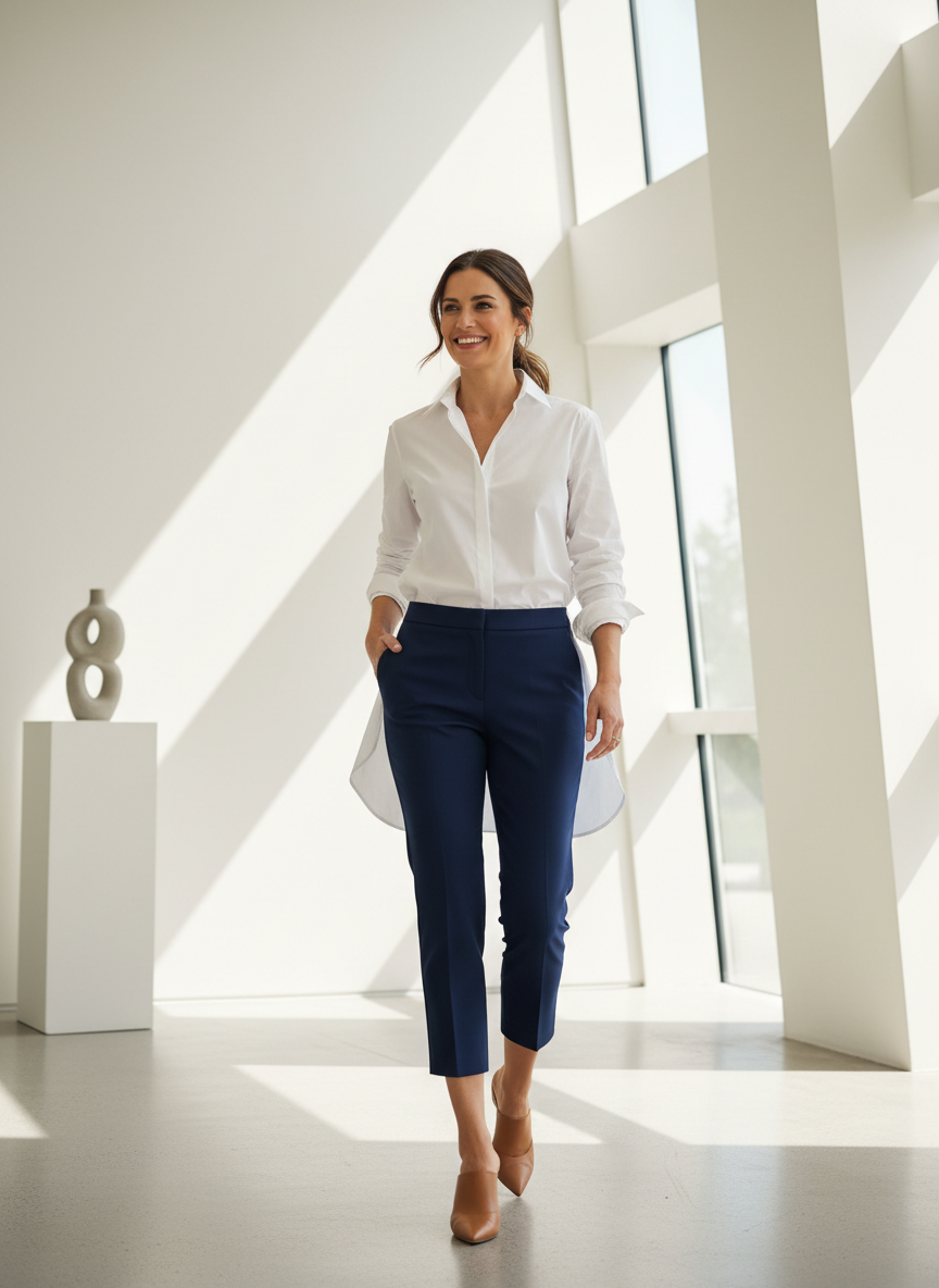 Slim capris in a neutral tone — think beige, navy, or black — work as the perfect canvas for a crisp white button-down shirt.