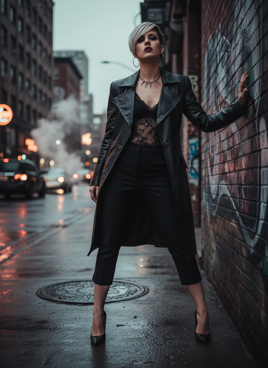 There is something undeniably cool about layering a delicate sheer lace cami under a strong, structured leather coat — the softness and toughness play off each other in a way that feels high-fashion without trying too hard.