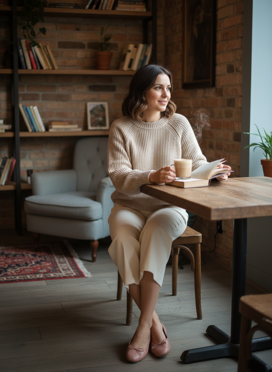 Their flat, feminine silhouette balances the softness of the knit without adding unnecessary height or formality.