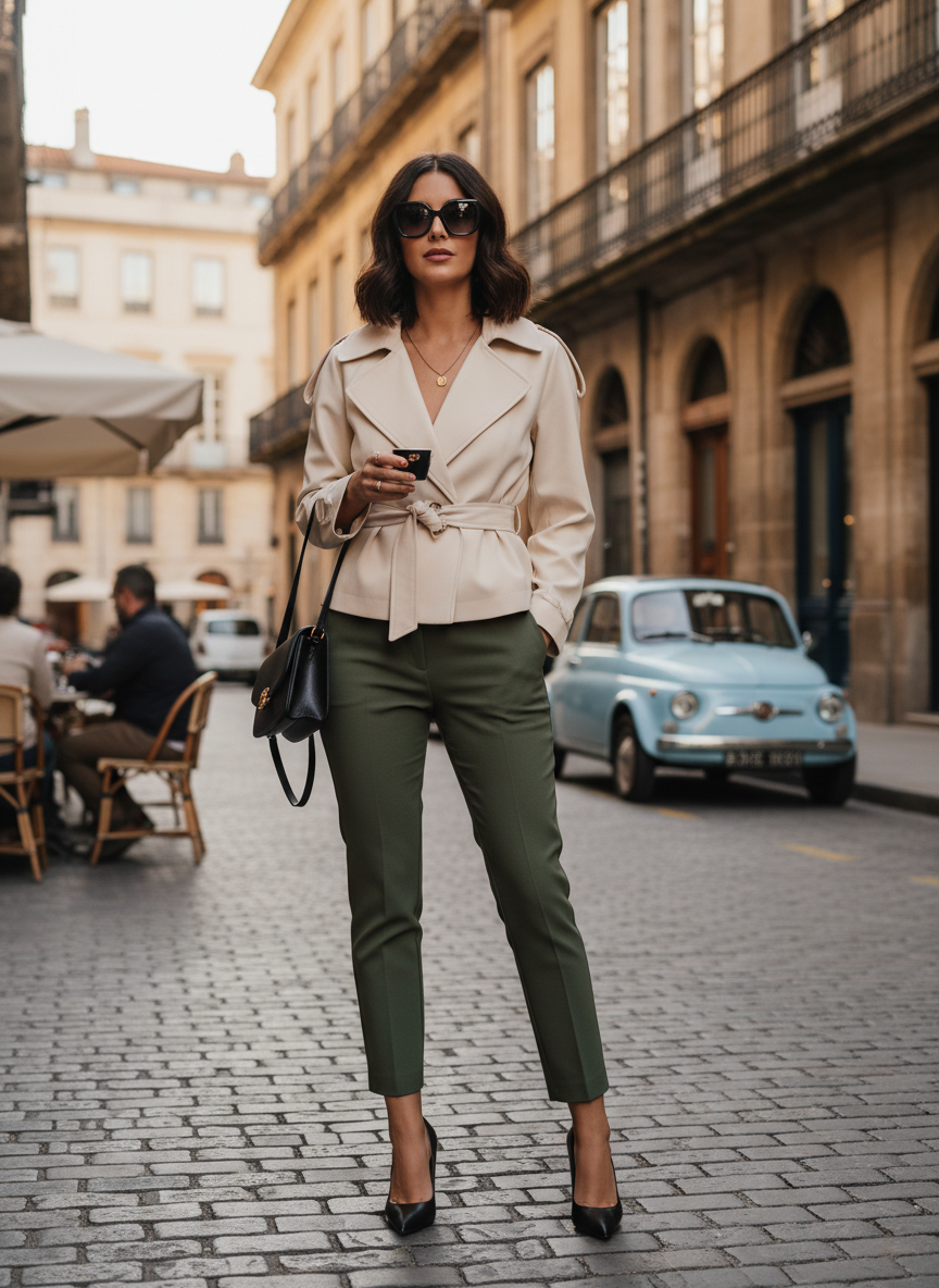 A classic camel or beige trench with black capris and black pointed heels is a foolproof combination that works for autumn evenings, work events, or city exploring.