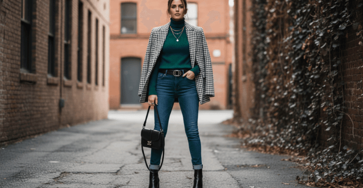 Skinny jeans paired with an oversized turtleneck or sweater vest create a balanced silhouette that plays with proportion in a flattering, modern way.