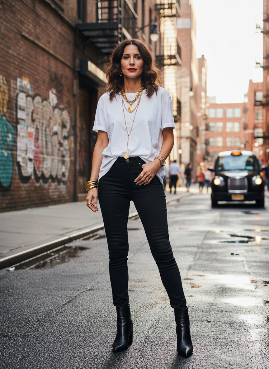 Skinny jeans paired with a boxy tee and statement accessories create that enviable model-off-duty vibe.