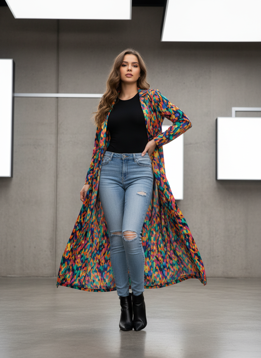 A colorful duster or patterned robe adds drama and personality to the outfit.
