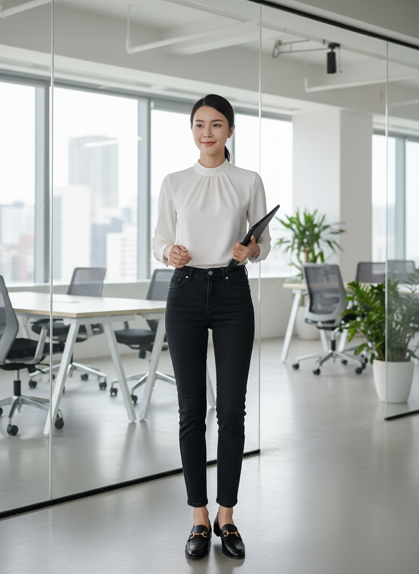 This combination works for casual weekends, coffee dates, or even relaxed office environments where dress codes are flexible.