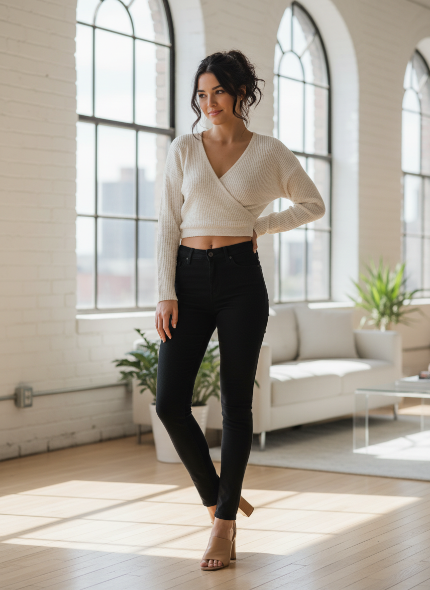 A wrap knit top adds texture and femininity, while heeled mules provide a sophisticated finishing touch.