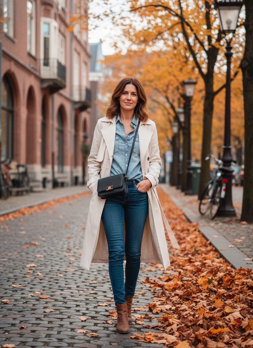 A classic trench coat adds an element of timeless elegance and works beautifully over denim layers.