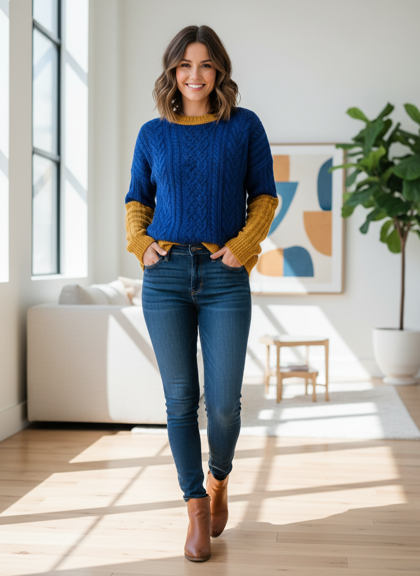 The combination of fitted denim and soft knitwear creates a balanced, approachable look that feels both comfortable and stylish without being overly trendy.