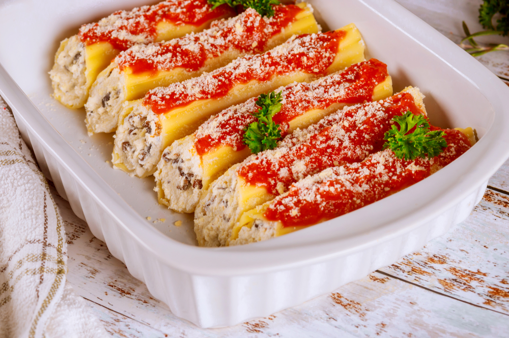 Pasta tubes stuffed with a creamy blend of ricotta, mozzarella, and parmesan create a vegetarian protein powerhouse with about 28 grams per serving.