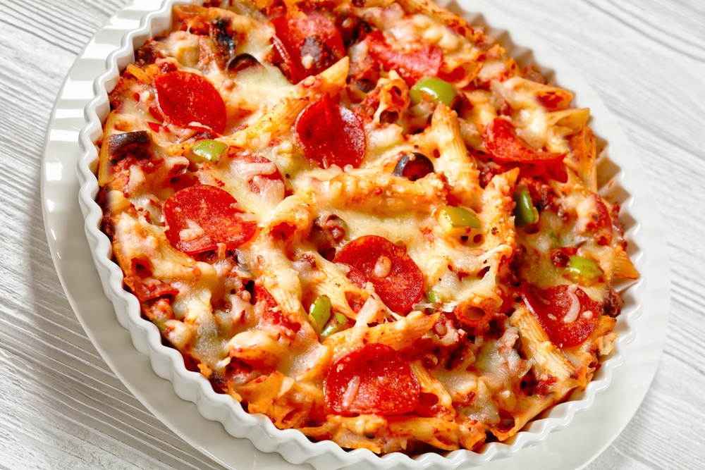 Layers of pasta, meat, cheese, and marinara sauce create a dish that satisfies pizza cravings without the guilt.