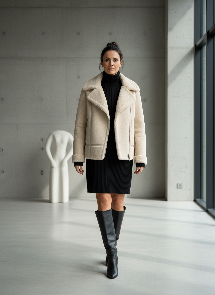 Monochrome dressing is always chic, and adding a shearling jacket makes it even better.