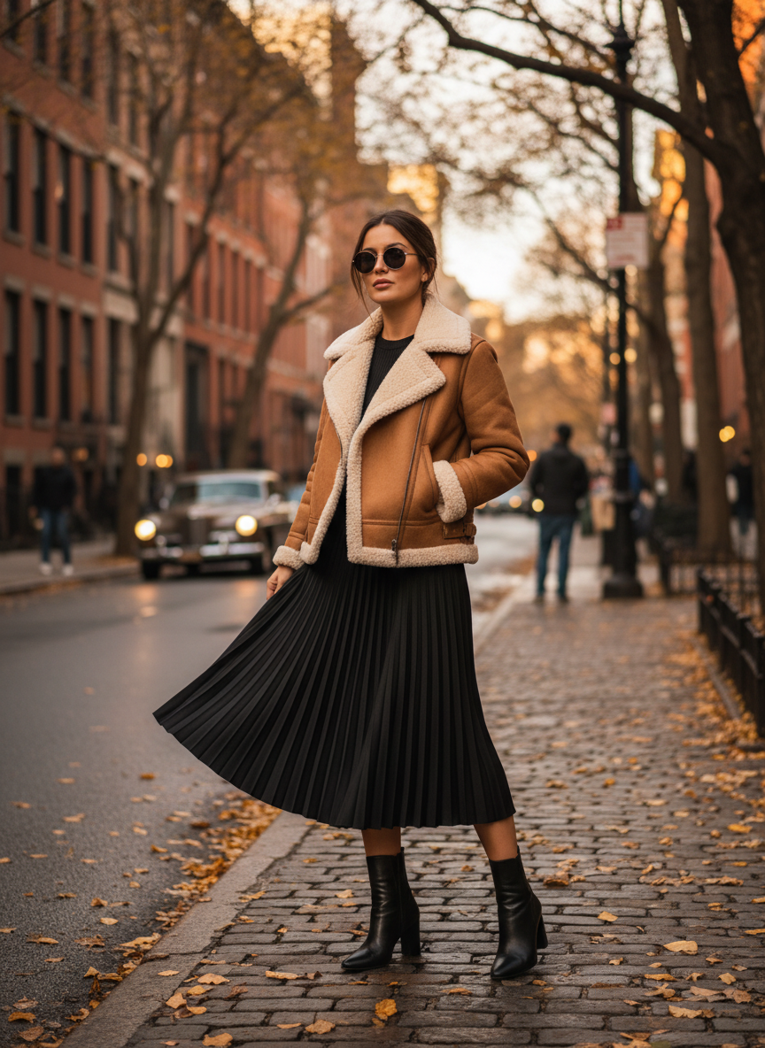 A pleated midi skirt brings softness and movement, while a shearling jacket adds texture and edge.