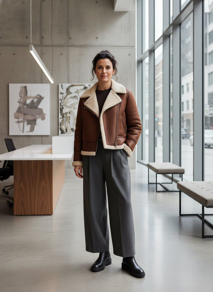 This combination proves that shearling jackets aren’t just for weekends—they can absolutely work in more formal contexts too.