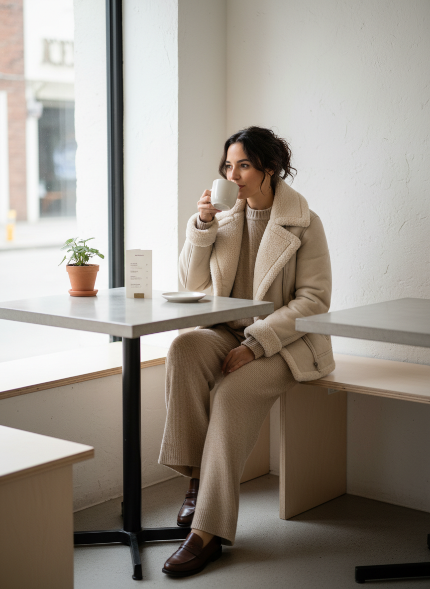 A matching knit set creates a streamlined base that feels luxurious and intentional, while the jacket adds dimension and warmth.