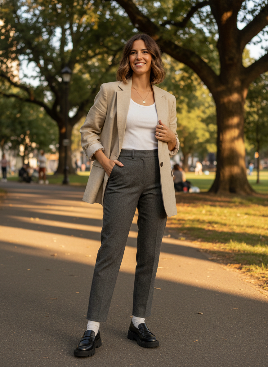 A boxy blazer paired with a simple white tank creates an unexpectedly fresh vibe when balanced with straight-leg wool trousers.