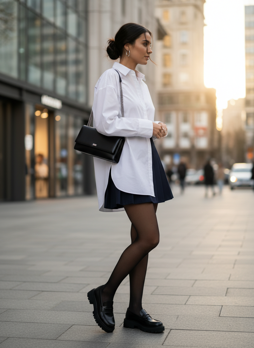 The contrast between the structured shirt and playful skirt length creates visual interest that feels youthful yet sophisticated.