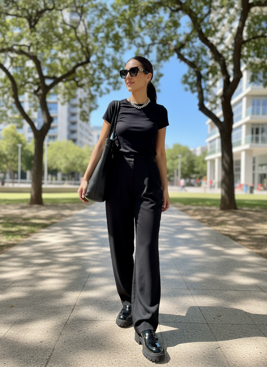 A fitted tee tucked into wide-leg trousers creates a sleek silhouette that feels both powerful and comfortable.