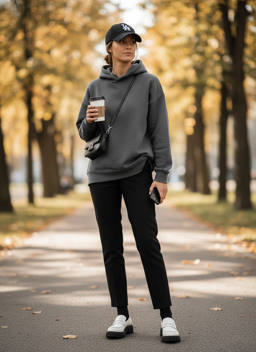 Tailored trousers bring structure and polish, balancing the hoodie’s relaxed fit.