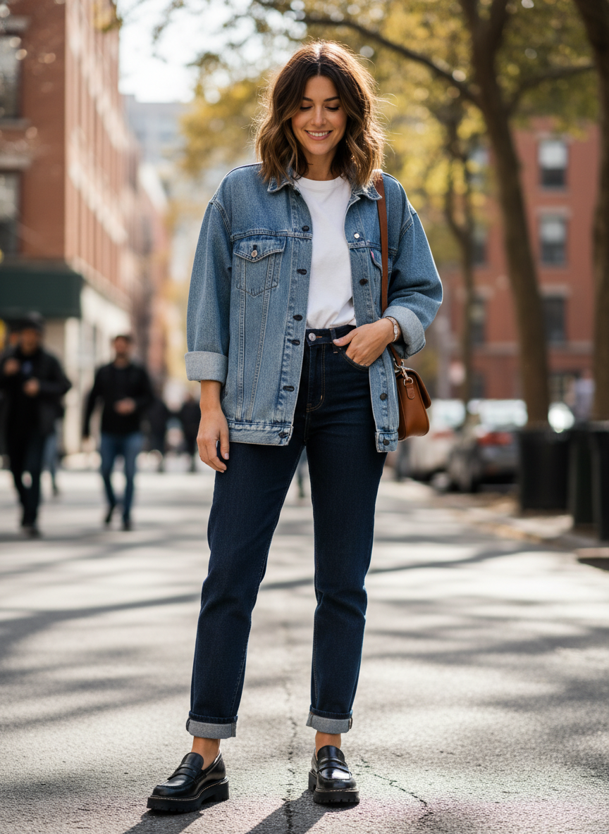 Chunky loafers with contrast stitching add a modern twist, elevating the outfit beyond basic denim-on-denim territory.