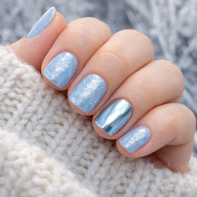 Soft blue hues mixed with shimmer or chrome finishes create an ethereal, cool-toned vibe that feels fresh and modern.
