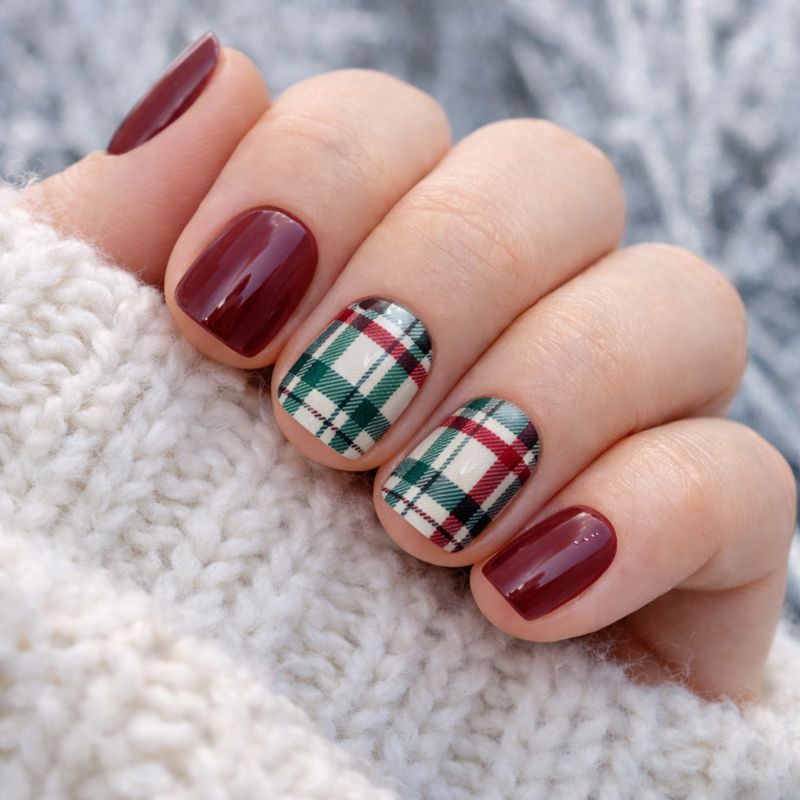 Typically, one or two accent nails feature the plaid pattern while the rest stay solid in complementary colors like burgundy, cream, or forest green.